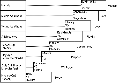 Erikson propõe que o desenvolvimento ocorre ao longo de toda a vida e é influenciado pelas características dos contextos sociais em que o indivíduo está inserido. Na sociedade, existem oito tarefas( 8 estádios psicossociais) com as quais as pessoas têm de lidar em todos os estádios do seu desenvolvimento. No entanto, em cada estádio, há um predomínio de uma tarefa, que assume a forma de um conflito ou crise (psicossocial) entre duas dimensões (uma positiva e uma negativa), induzido pela interacção entre as exigências da sociedade e as características do indivíduo. Neste momento de crise o indivíduo cresce psicologicamente e a forma como resolveu os diversos conflitos vai afectar a forma como lida com eles no presente e no futuro.